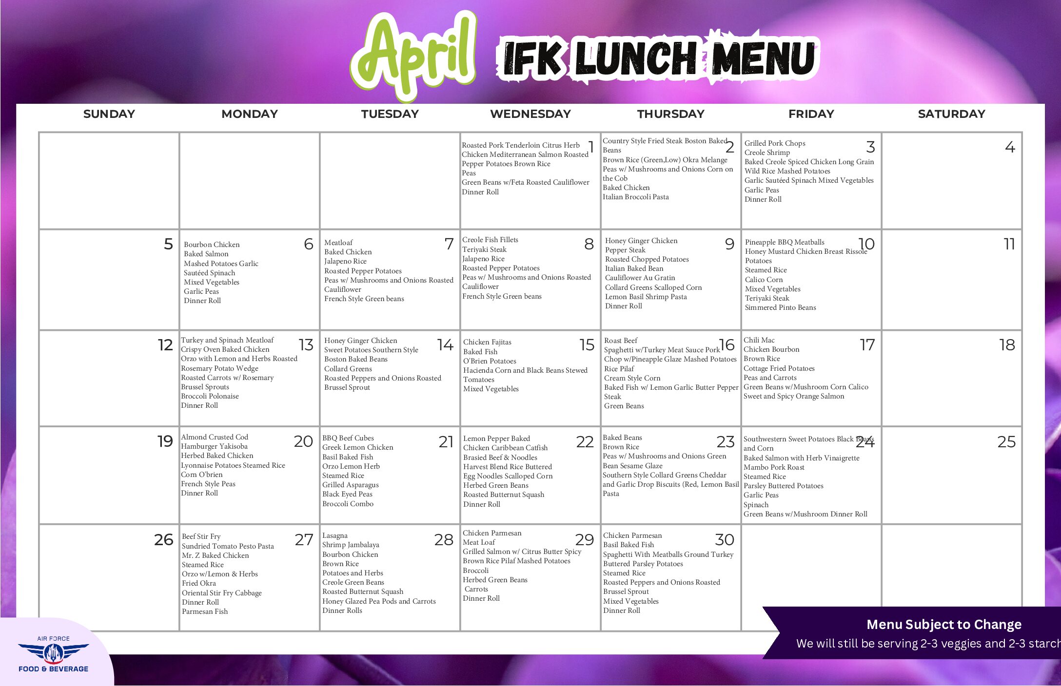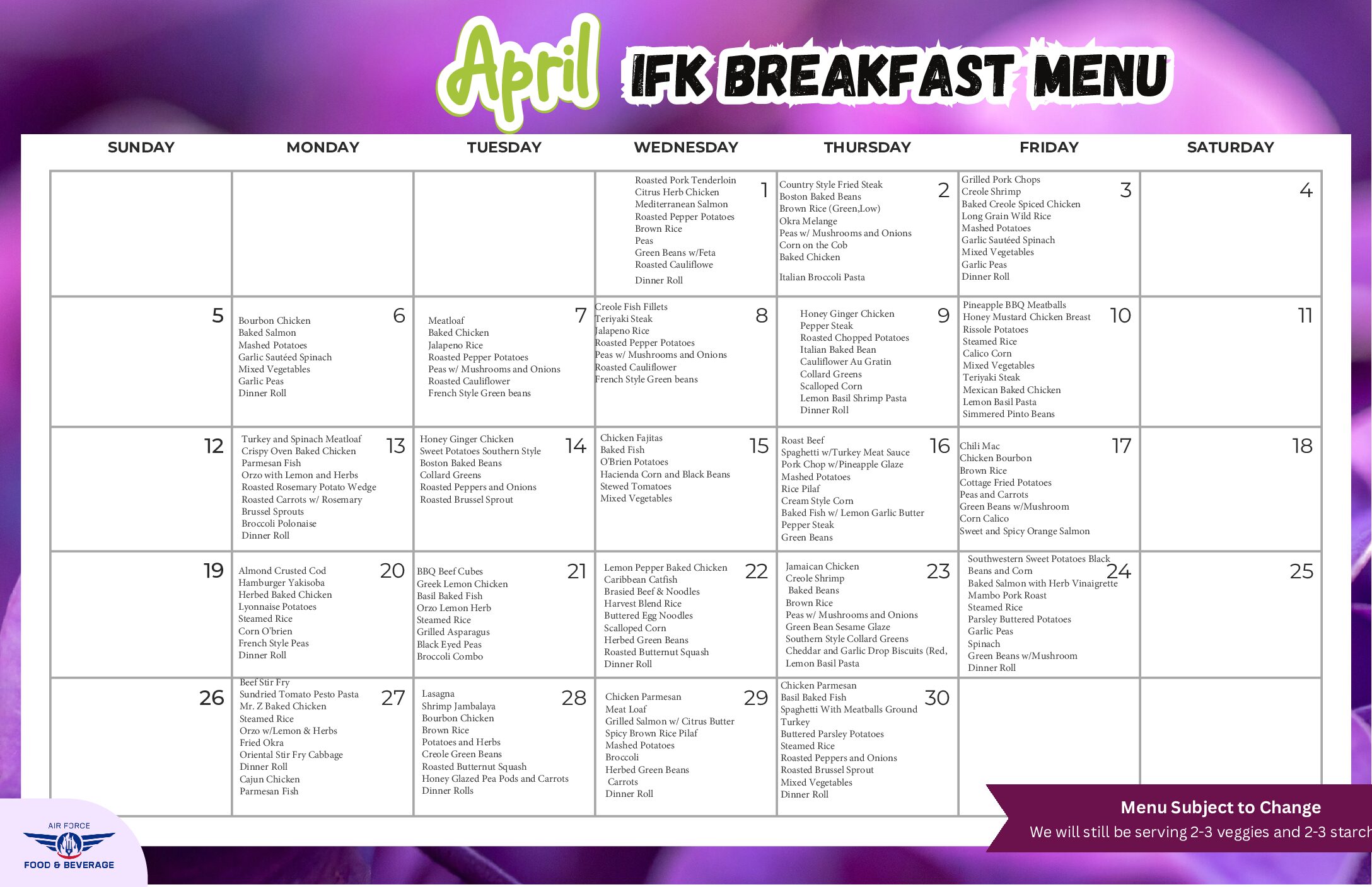 April In-Flight Kitchen Menus
